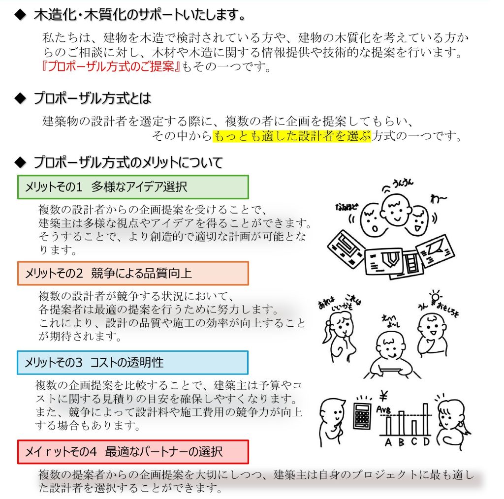 木の特性を活かした、環境や用途に相応しい木造建物を実現することで、木の良さをアピールし、木造建築の普及・啓発に努めていきます。