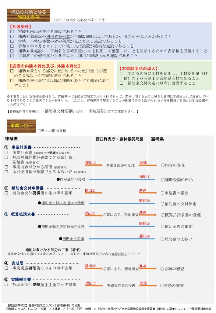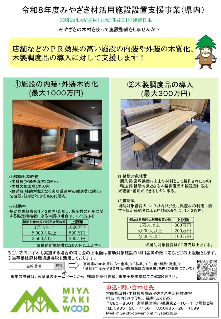 宮崎県山村・木材振興課みやざきスギ活用推進室では、「みやざき材活用施設設置支援事業(県内)」の令和8年度募集を開始しましたのでお知らせします。事業の詳細は、添付の案内チラシ及び募集要領によりご確認ください。