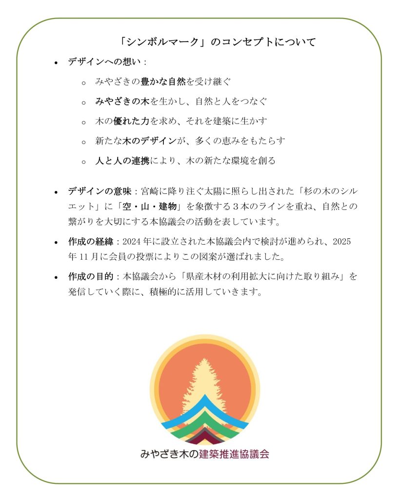 ニュース みやざき木の建築推進協議会の「ロゴマーク」が出来ました 2026.01.15 みやざき木の建築推進協議会では「ロゴマーク」を作成しました このロゴマークは、『宮崎の豊かな自然を守り、建築を通して新たな木の文化をつくり、幸せな社会を創造する』をテーマとして作成しています。