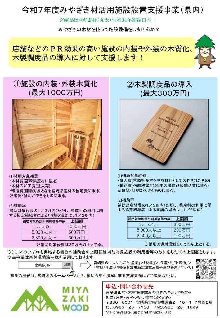 宮崎県では、みやざき材活用施設設置支援事業(県内)の2次募集を開始しましたのでご案内します。お近くにPR効果の高い施設の内外装木質化や木製調度品の導入を検討されている方がいれば、本事業のご案内をお願いします。