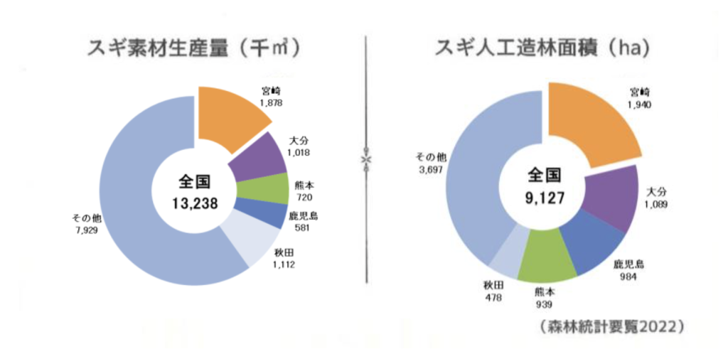 宮崎県の面積の76%が森林です。また、杉の人工林の広さ、国産材の出荷量も全国でトップクラスです。なかでもスギの素材(丸太)生産量は30年以上連続日本一を記録しています。