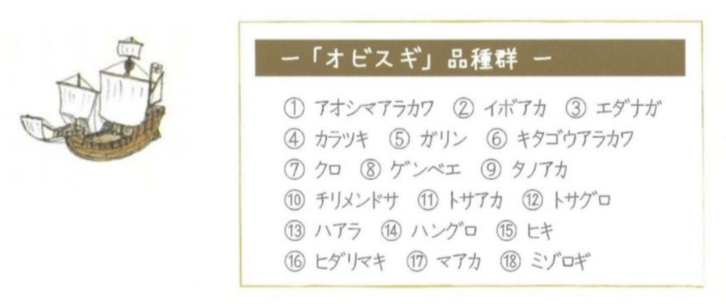 造船材の需要が減少した現在も、真直ぐおおらかに育つ性質で建築用として活用されています。オビスギにはアカ系とクロ系があり、それぞれに特徴の違う15種類の品種が存在します。近年では、社会のニーズに応じた品種改良が進められており、特に花粉をあまり出さない品種が多く植えられています。