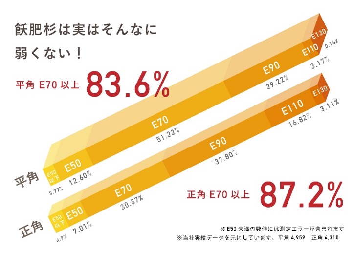 オビスギは初期成長が早いため未成熟材の割合が多く、強度が懸念された時代もありました。ですが高樹齢化に伴い、近年では材長3〜4m、梁成210㎜程度までは、一般的に構造計算で要求されるE70以上の無垢材も安定的に入手できるようになりました。