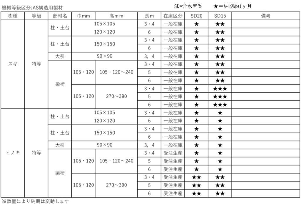 ただし、サイズ、強度、等級、数量により、原木からの調達が必要になる場合もあり、納期が変動するため、設計段階での打合せが安心です。